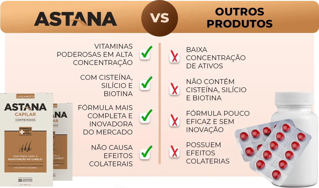 A fórmula do ASTANA CAPILAR é projetada para atender eficazmente de dentro para fora as necessidades capilares tanto de homens quanto mulheres, que desejam fortalecer e proteger seus cabelos, seja qual for o seu tipo de cabelo. Contudo, este produto não deve ser consumido por gestantes, lactantes e crianças e indivíduos com alergia a frutos do mar.